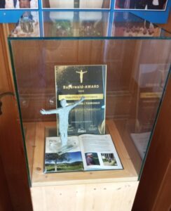 Der Bayerwald-Award, der dem Trailpark Bischofsmais in der Sparte Veranstaltung/Tourismus verliehen wurde, strahlt nun von seinem Ehrenplatz aus die Besucherinnen und Besucher des Rathauses an.