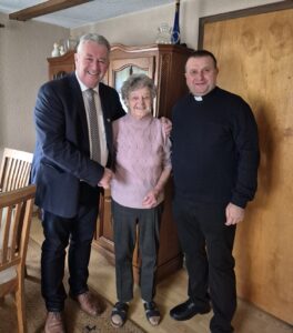Im Bild von li. nach re.: Bürgermeister Walter Nirschl, Jubilarin Maria Scheib, Pfarrer Paul Ostrowski; Urheber: Walter Nirschl