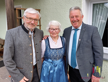 Im Bild v. r.: 1. Bürgermeister Walter Nirschl, Margaretha Pledl, Diakon Albert Achatz