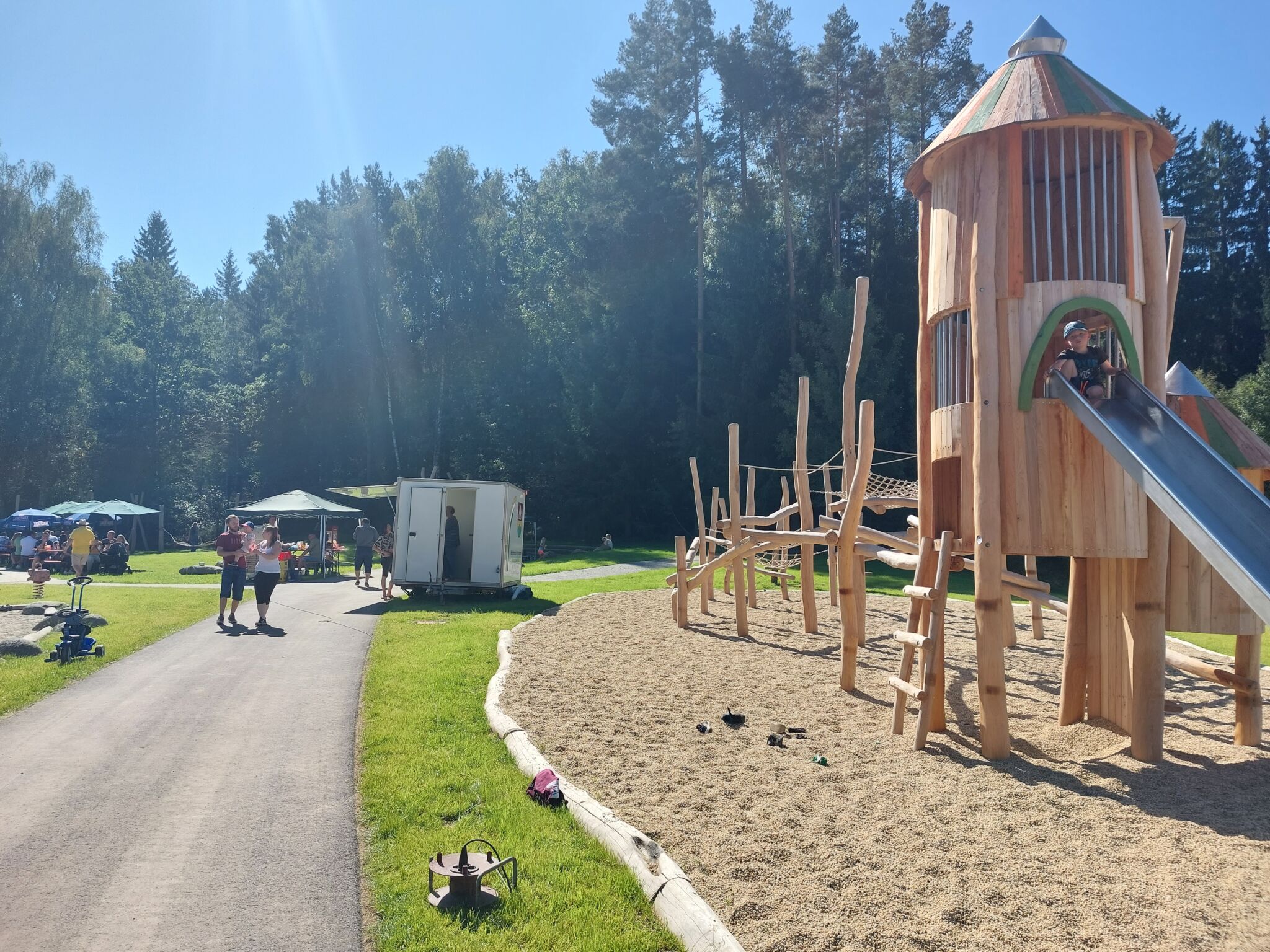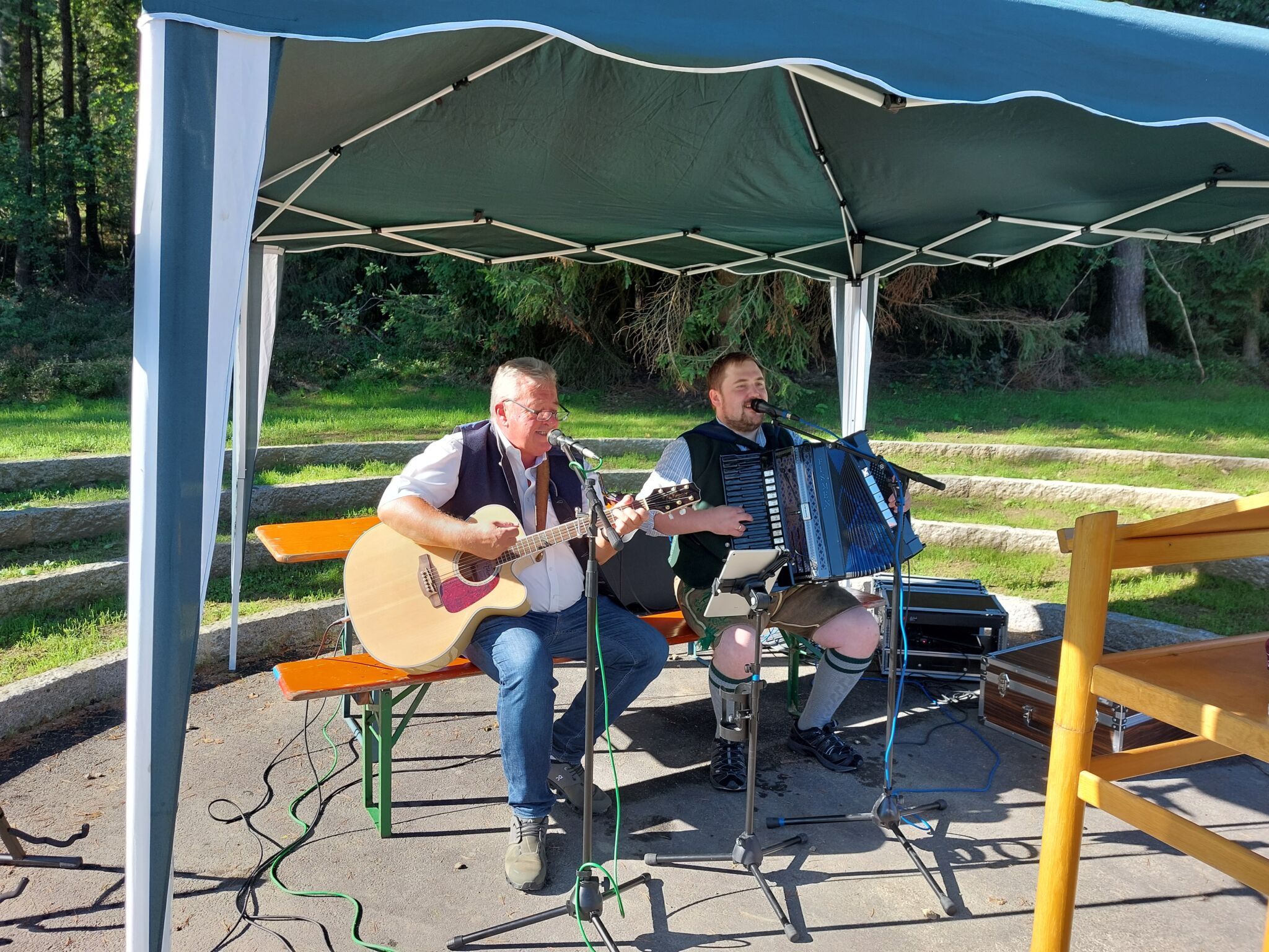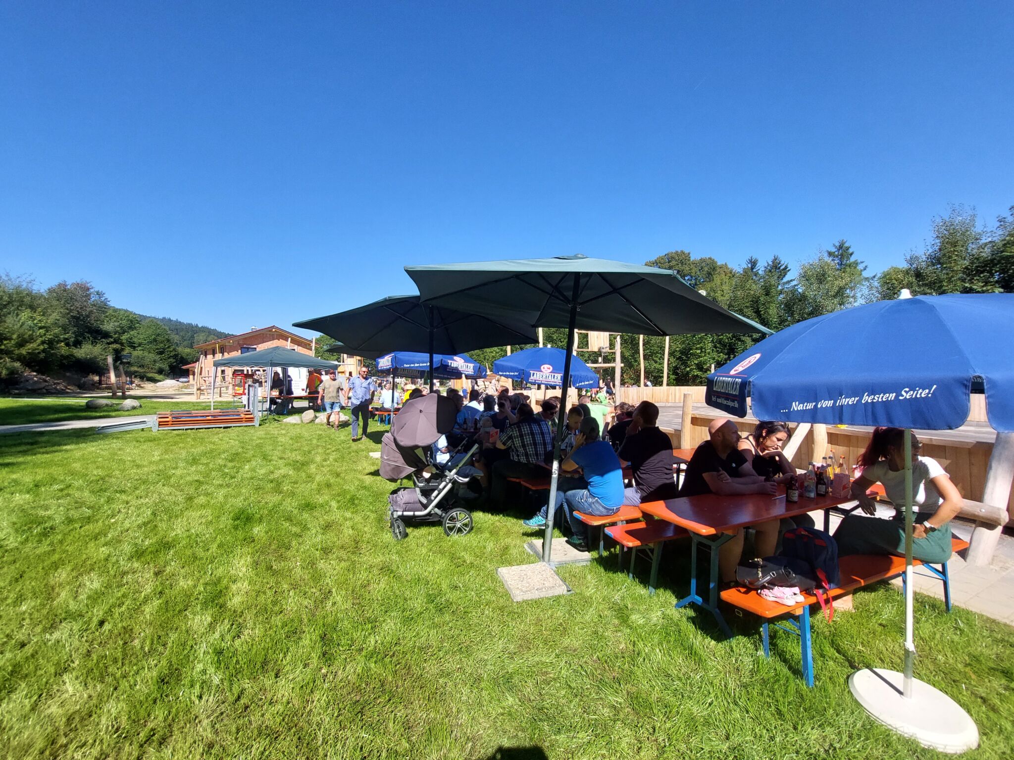 „Hier ist für jeden etwas dabei“, sagte Bürgermeister Walter Nirschl. Gemeinsam mit der Regierung, den Planern und der Firma Detzer zerschnitt er schließlich symbolisch das Band und gab den Spielplatz so zum Bespielen frei. Das ließen sich die vielen Kinder nicht zweimal sagen. Sie testeten die neuen Geräte ausgiebig und freuten sich zudem über das kostenfreie Popcorn, dass die Mitarbeiterinnen der Touristinfo verteilten. Die Bauhof- und Gemeindemitarbeiter versorgten die Gäste zudem mit kühlen Getränken und warmem Leberkäse. Ein besonderer Dank ging an Anwohner Florian Pauli der gemeinsam mit Bürgermeister Walter Nirschl die Gäste musikalisch bestens unterhielt. So wurde die Spielplatzeröffnung zu einem Fest mit fröhlichen Gesichtern und leuchtenden Kinderaugen.