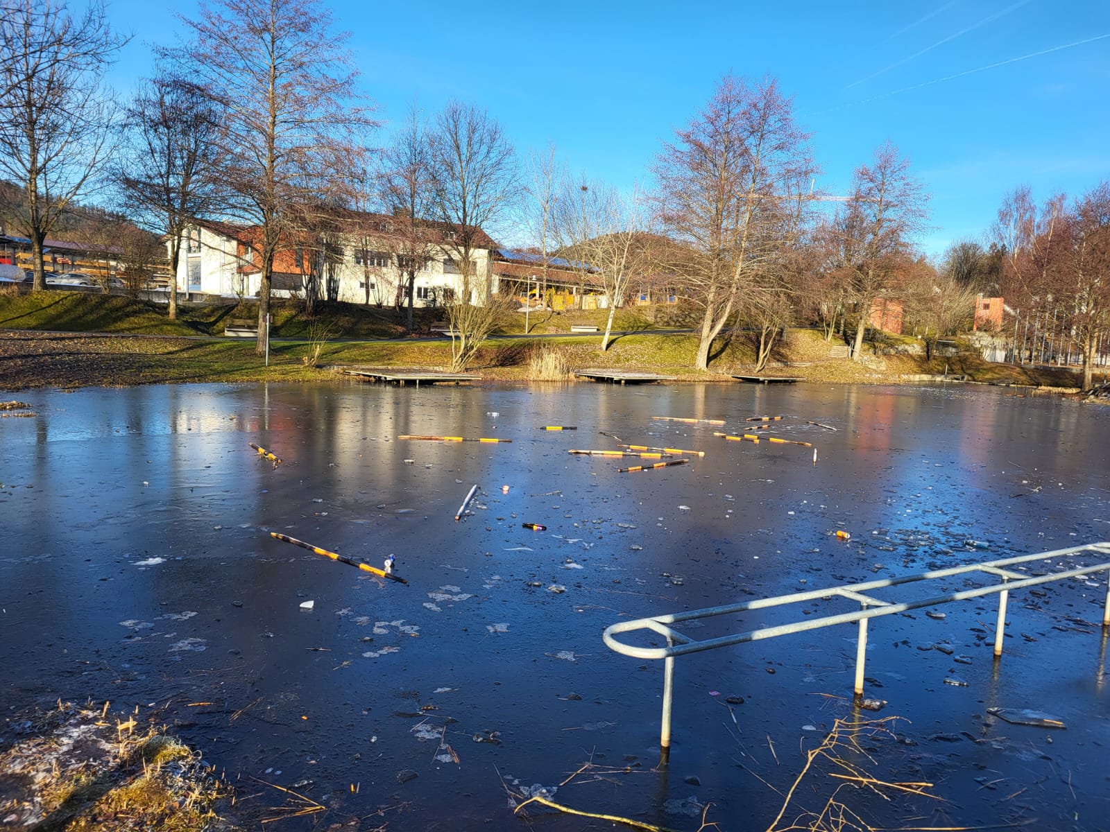 Ein zerstörtes Vogelfutterhäuschen und unzählige Schneestangen, die mit einer großen Anzahl an Flaschen in den Kurpark-Weiher geworfen wurden, zeugen von der unverständlichen Zerstörungswut unbekannter Personen.